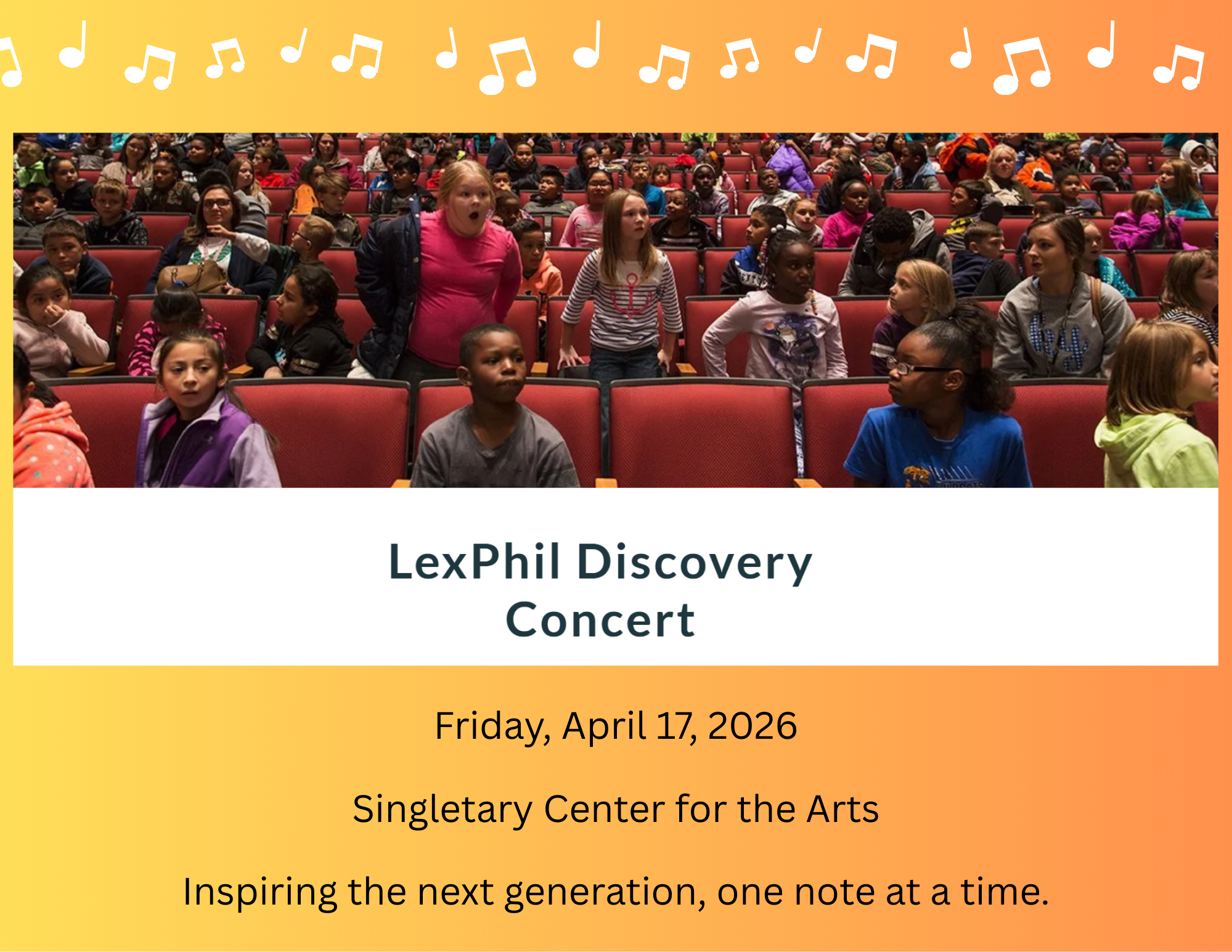 Our 4th graders will travel to the Singletary Center for the Arts to attend the Lexington Philharmonic Discovery Concert. Presented by the Lexington Philharmonic, this interactive, curriculum-connected concert is designed especially for elementary students.